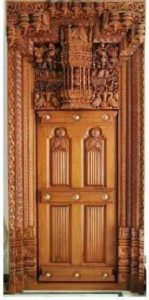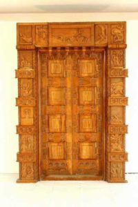 This door is a reproduction of the doors belonging to the rajputana havelis in the reign of raja todarmal (one of the nine gems in the court of emperor akbar) in jaipur, rajasthan. The rajputs were a rich clan in both tradition and history. Honour was a matter of pride and they would lay down their life for it. The rajput chieftains were spread over vast tracts of desert land and had to do with what little water resources they could muster. thus the houses were built around oasis / fresh water springs in the desert. This group housing were called havelis (mini palaces) which housed the chieftains family and also those of his subordinates and servants. The haveli was built like a fortress with huge thick walls and ramparts to see the enemy from far and mount a counter attack. the mahadwara of the haveli was set into a stone frame and was of double thickness, having embellishments of brass and iron to give both beauty and strength. The pointed brass studs thwarted attacks from enemy elephants who were used to push open the doors. the umbro or frame was made of marble and inlaid with precious stones and gems. The shutters were made of sheesham (rosewood), carved and inlaid with brass. They had metal plates and iron reinforcements supported with iron hinges and tower bolts. A solid wooden beam, the width of doorway was placed in between to lock the doors at night. the pattern of inlay work was similar to the design of rangoli, an ancient form of drawing on the floor – geometric design to enhance the vastu of the home and add colour to the festivities. The doors were so heavy, that they were operated by their dwarapalakas. the ancient rajasthani art has almost died out due to non-availability of natural wood and increasing cost of labour.